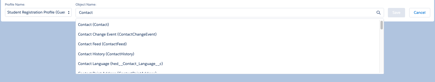 - Select the Site Guest User Profile under Profile Name and Contact under Object