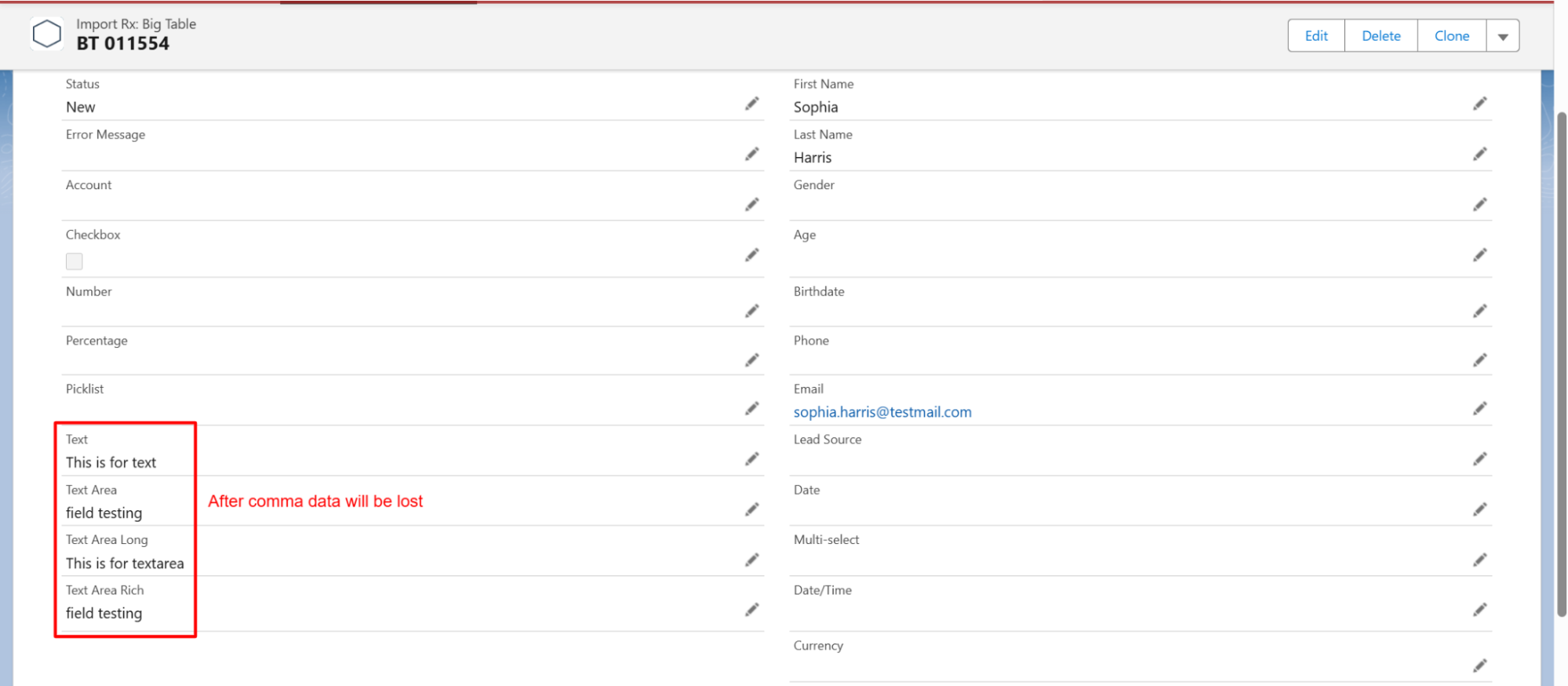 Comma with space delimiter limitation: When the user uploads a .txt file using a comma with a space as the delimiter, with headers and all text fields, the Big Table record processes the text field value only up to the comma.