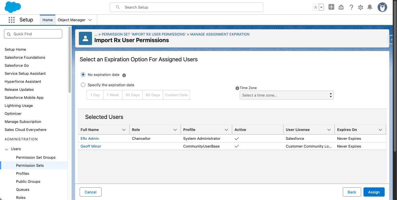 - On the "Select Users to Assign" page, choose your organization's Import Rx user(s) from the list and click Next to review your selections and optionally configure an expiration option for assigned users.